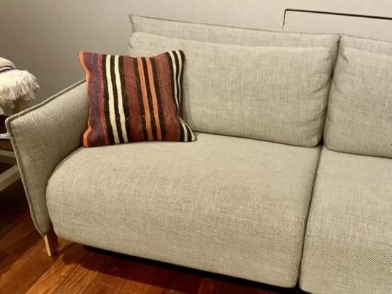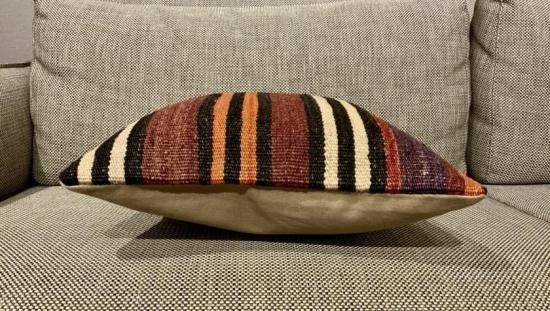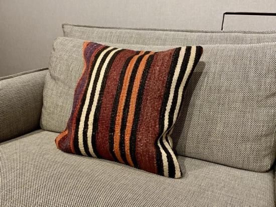 初めてキリムを手にされる方には、チクチクするという感触があるかもしれません。感じ方には個人差がありますが、それがキリムの風合いという事をご理解下さいませ。チクチク感が気になるという方には、使い方としまして頭や顔をつけるときには滑らかな肌触りの裏地(コットン)面を、インテリアとして楽しまれる時にはキリム面を出してご使用されることをご提案いたします。