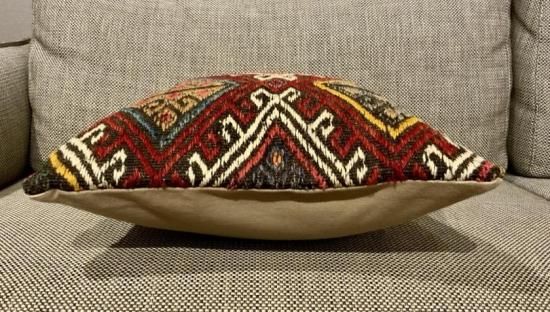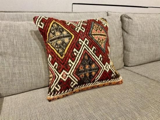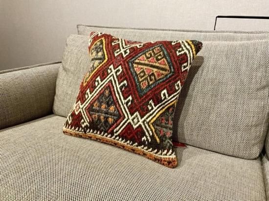 何十年も前に織られたオールドキリムの状態の良い部分をカットしてキリムのクッションカバーにしました。何回も洗い、日に当ててこそ出てくる色合い風合いに趣きを感じます。ソファーにいくつか並べてお洒落にディスプレイしてみてはいかがでしょう。